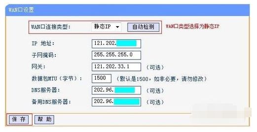 3、进入管理界面后,点击 网络参数 >> WAN口设置,WAN口连接类型选择为静态IP,并填写IP地址、子网掩码、网关、DNS等地址,点击 保存。如下图: