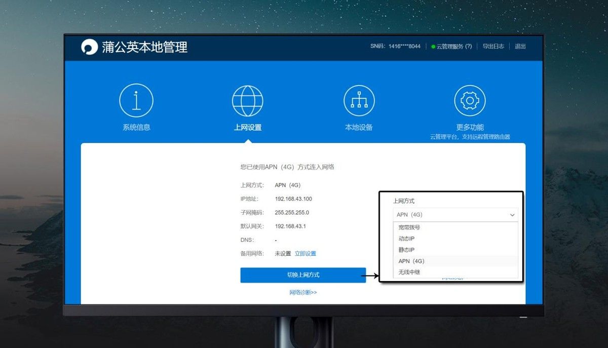 装卡如上图所示,SIM卡的芯片朝上,把卡槽推进去插上电源即可;R300A支持电信联通移动三网4G信号,开机以后,蒲公英R300A会自己检测上网方式,4G上网的话无需任何设置;如果你有宽带,可以把宽带设置成主网,4G上网设置成备用网络,确保万无一失。
