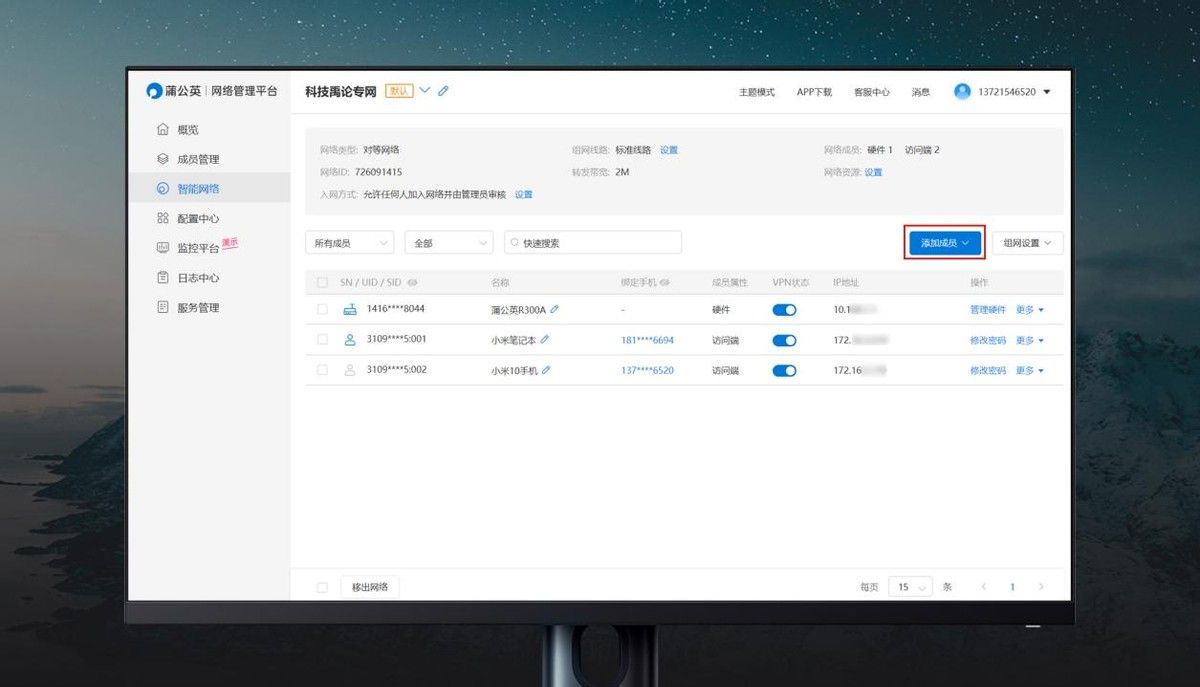 网络搞定后,后面的事就轻而易举了,只需把电脑与蒲公英R300A组网,就能在家里远程访问野外的监控视频。打开蒲公英网络管理平台,选择智能网络,点击添加成员,输入R300A的SN码即可组网,SN码在路由器背面;免费用户最多只能组网三个客户端,如果家里有多台电脑需要看监控,就必须在家里布置一台蒲公英路由器。