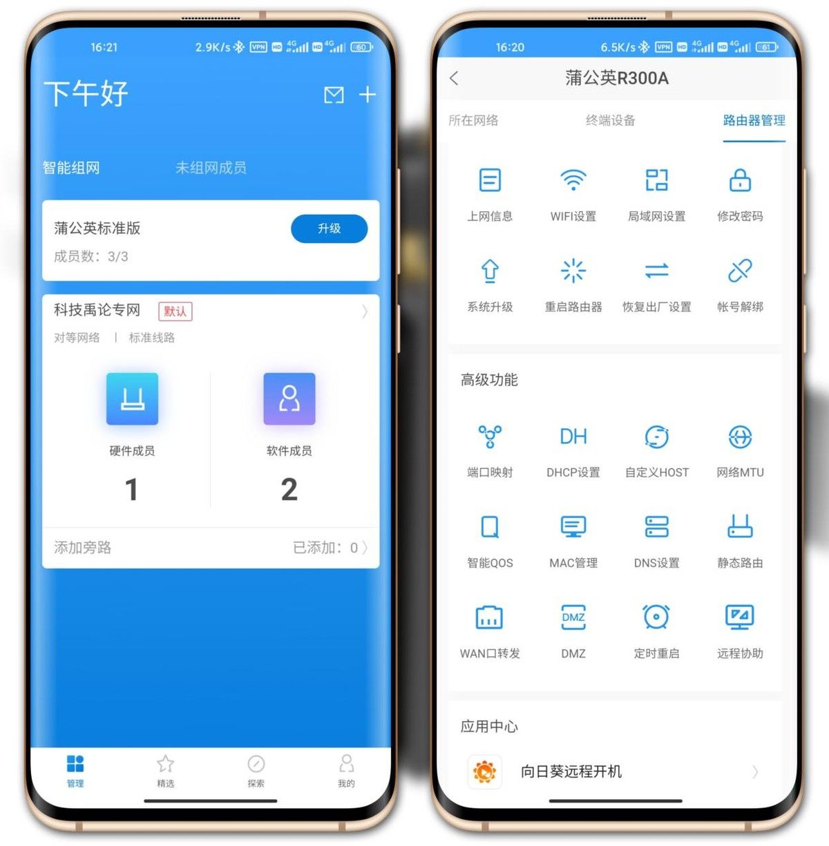 除了在电脑PC界面管理路由器,蒲公英R300A还支持手机APP远程管理,可以自由管理组网成员;可以查看上网信息、设置WIFI、重启路由器、设置DHCP、设置定时重启等功能;另外还有一个功能支持向日葵远程开机,想维护网络的时候无需去野外,在家里轻松搞定。
