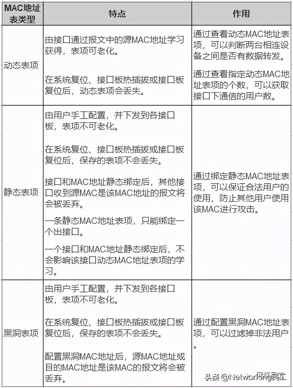 MAC地址表中的表项分为:动态表项、静态表项和黑洞表项。另外交换机的MAC地址表中还存在一种业务类型的MAC地址表项,譬如:安全MAC、MUX MAC、Authen MAC、Guest MAC等。该类MAC地址表项是由对应业务维护的,一般是通过动态表项转换来的。