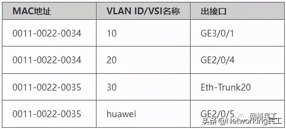 MAC地址表是以MAC地址和VLAN ID或VSI为索引来唯一标识。当一台目的主机属于多个VLAN或VSI时,在MAC地址表中就会存在相同MAC地址拥有多个不同VLAN ID或VSI的情况。表2-2中是四条不同的MAC地址表项。如第一条MAC地址表项的作用是:从设备任意接口进入的目的MAC为0011-0022-0034,VLAN ID为10的报文,都会从GE3/0/1接口转发出去。