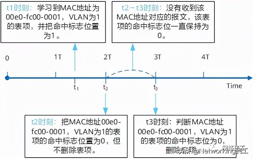 - 在t3时刻,设备检查到该表项的命中标志位为0,认为该表项的老化时间到达,将删除此条表项。