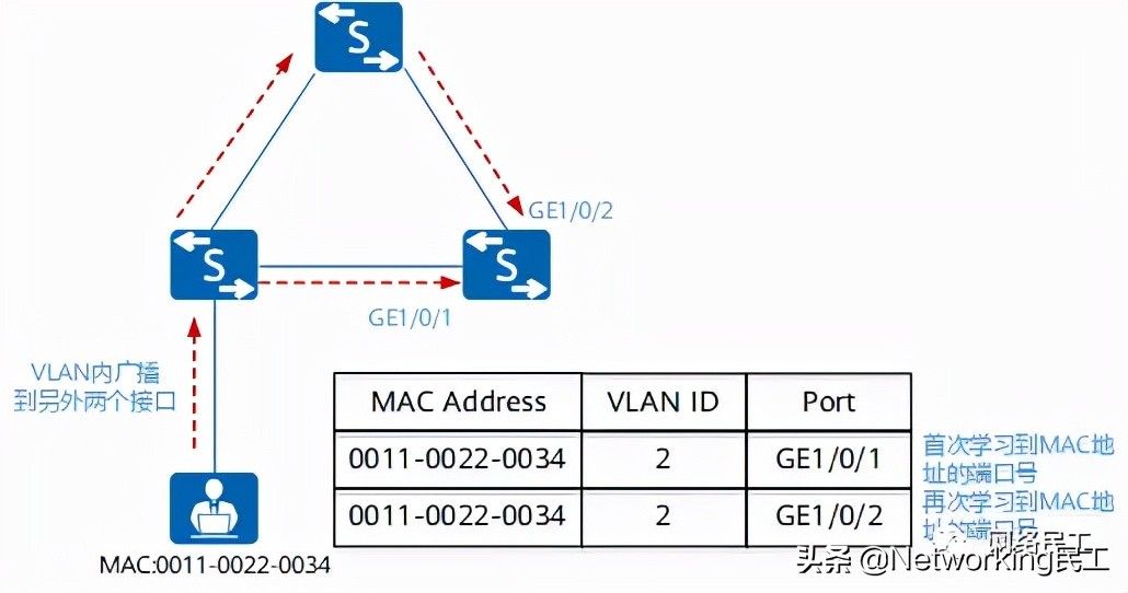 如图2-2,HostA向SwitchA发送数据时,SwitchA从数据帧中解析出源MAC地址(即HostA的MAC地址)和VLAN ID。