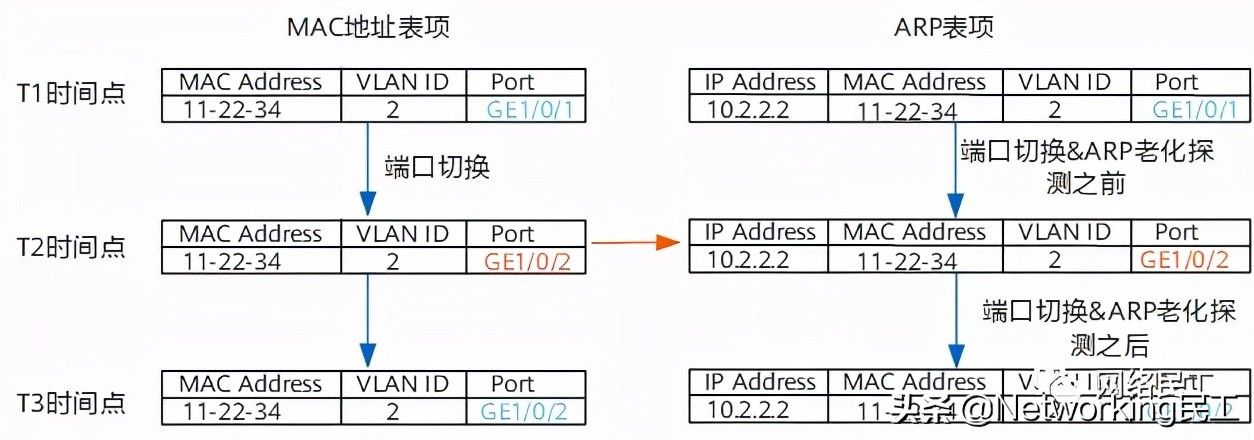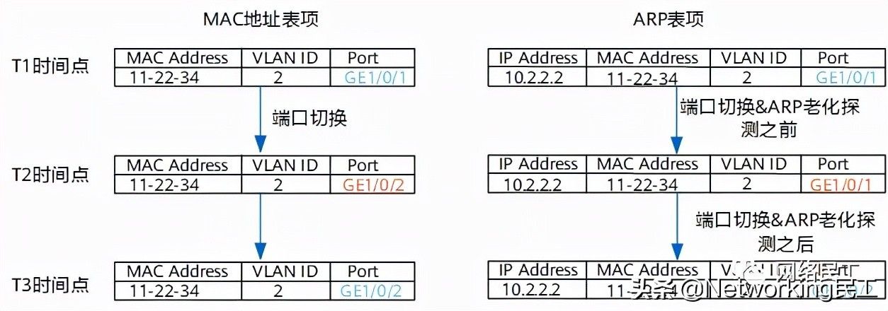 一般来说设备上的MAC表项和ARP表项的出接口是一致的。如图2-7所示,在T1时间点,MAC地址表项和ARP表项的出接口是一致的,都是GE1/0/1。当端口切换后,在T2时间点,MAC地址表项的出接口在收到报文时立即刷新为GE1/0/2,但是ARP表项的出接口还是GE1/0/1,需要等待T3时间点即ARP表项的老化时间到达后,通过ARP老化探测,才会刷新为GE1/0/2。这样就在T2时间点和T3时间点之间,ARP表项的出接口是不可用的,会导致不同网段间设备的通信中断。