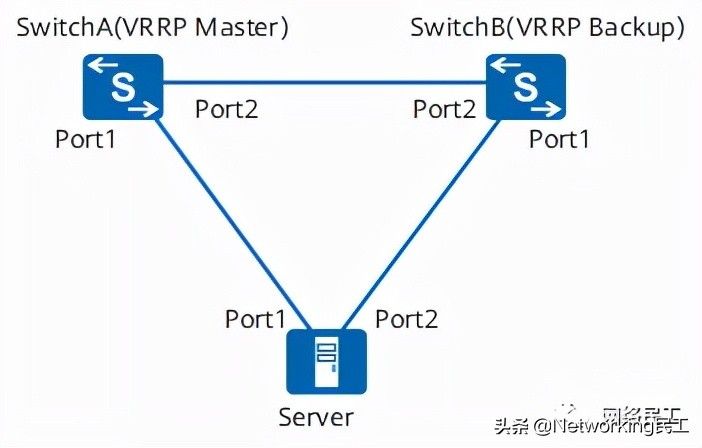 - SwitchA为VRRP主设备,一开始服务器使用Port2发送报文,此时SwitchA学习到的服务器ARP表项和MAC表项都在Port2接口上,SwitchB学习的服务器MAC在Port1接口;