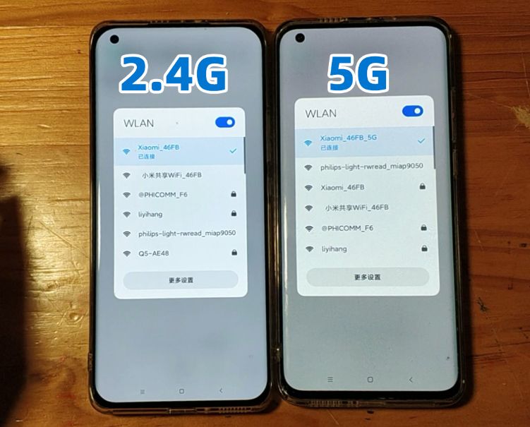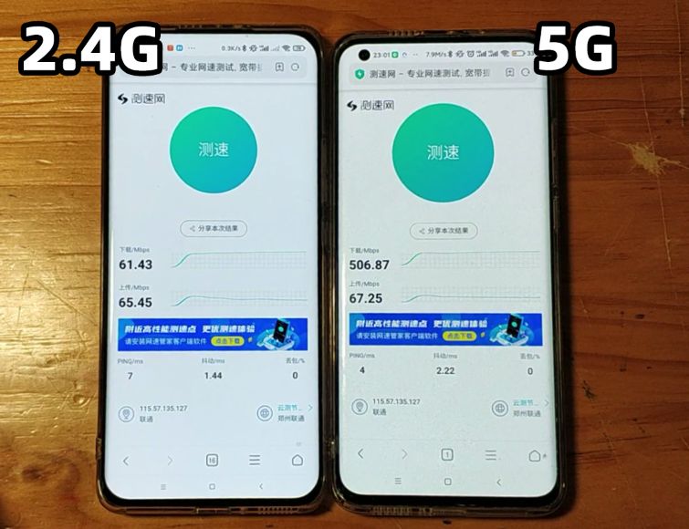 用两台同样的手机,一台连接2.4G频段的WIFI,另一台连接5G频段的WIFI,在相同距离、相同环境情况下,可以看到两种频段的速度相差大概10倍左右,5G无线网络的速率相当于2.4G频段无线网络的10倍。