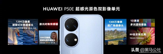 主摄是 5000 万像素超感光原色镜头,RYYB 传感器,同时还搭配 1300 万像素超广角镜头 、1200 万像素潜望式长焦镜头 (OIS 5 倍光变 ),还有通道多光谱传感器、激光对焦传感器,支持 16-1350mm 80 倍变焦范围。
