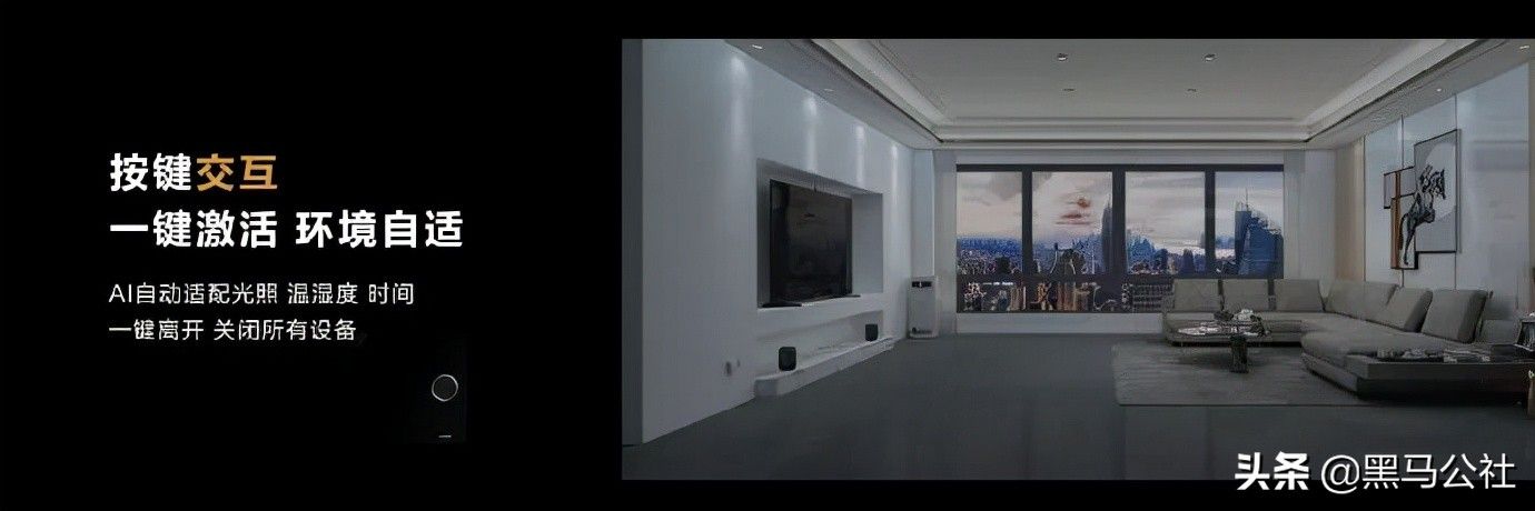 华为的全屋智能解决方案,面对清晨、中午、傍晚不同环境,AI 可以实现主动预判,为你调配适宜的家居环境。9.2mm 超薄智能面板,集场景、照明、遮阳、新风、地暖、空调六大控制于一身。