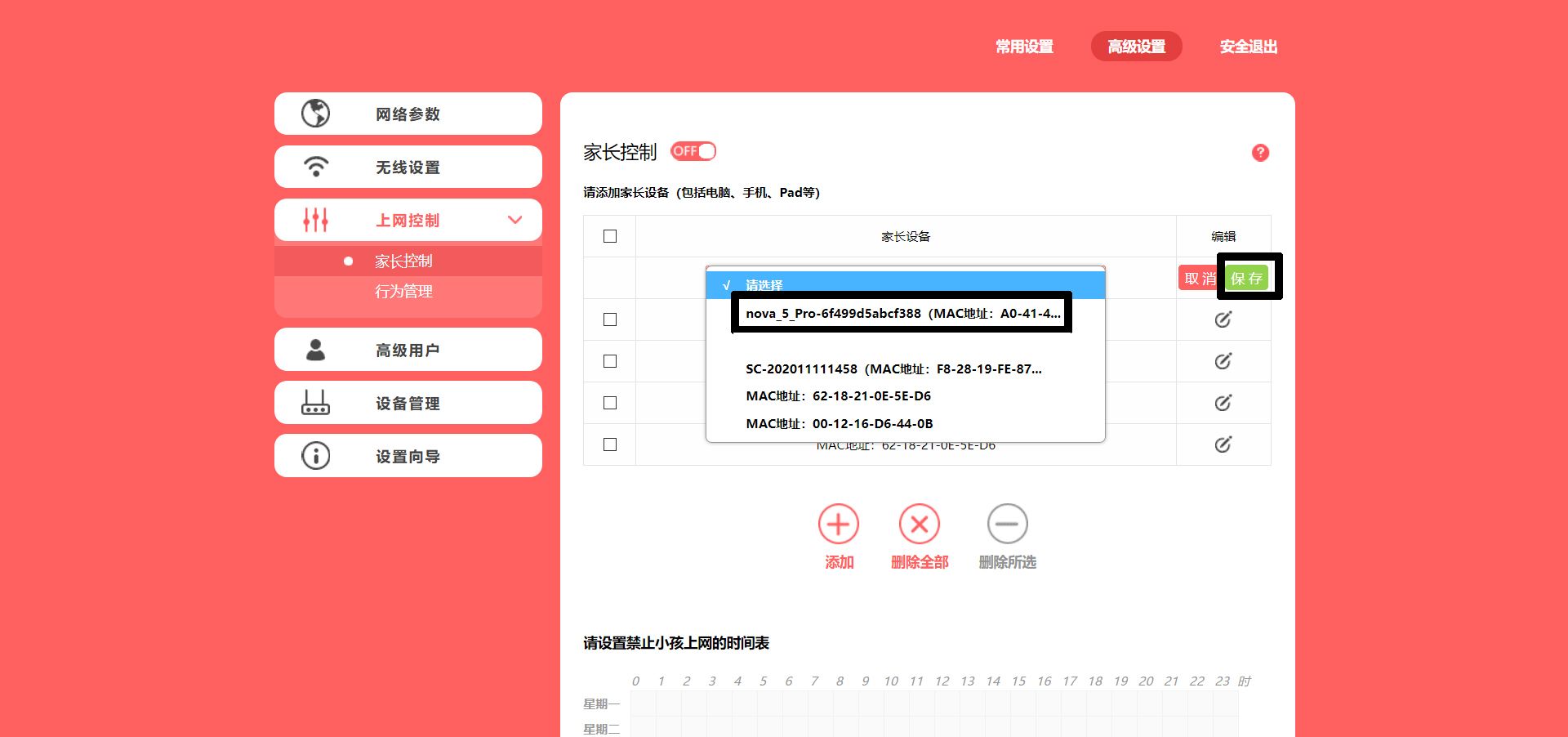 6.在弹出的新条目中,点击列表框,选择家长设备,然后点击保存。
