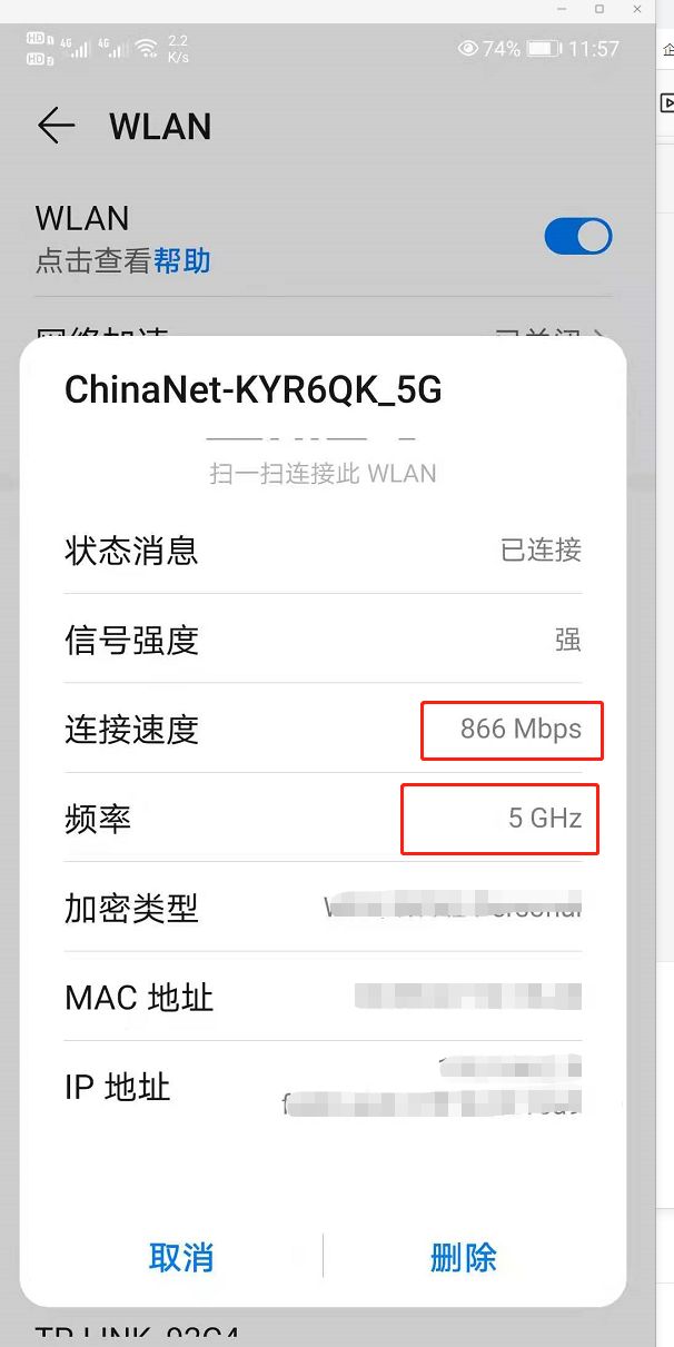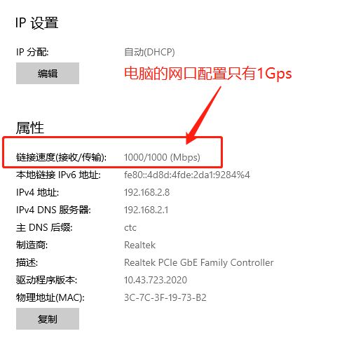 然后,就是看电脑网卡配置或者手机或者平板电脑配置是否支持千兆宽带。这个也是关于到网速。就好比有足够量的水,但是你没有足够大桶管接水,道理一样。怎么知道你自己的电脑配置,点击网络,点击查看属性。如下截图,这是本人的电脑配置。如果你的电脑支持10Gbps ,那你的下载网速可以接近900Mbps 。而我的只能达到400Mbps左右。本人的手机支持WiFi 的5G频段,连接速度可达866Mbps,实际测试,速度可达380Mbps左右