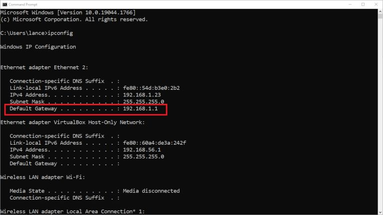 接着输入:ipconfig运行该命令,我们就可以看到 “以太网适配器”或“无线 LAN 适配器”下的“默认网关”。这个就是的路由器的IP地址。大多数路由器使用地址 192.168.1.1,但情况并非总是如此,因此你首先要确认路由器的地址。查到地址后,打开浏览器直接输入查询到的这个IP地址。