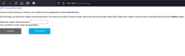某些路由器提供密码恢复功能。如果你的路由器属于这种情况,则在输入错误的用户名和密码一定次数后,应显示此选项。通常,此窗口将询问路由器的序列号,你可以在路由器的底部或侧面找到该序列号。