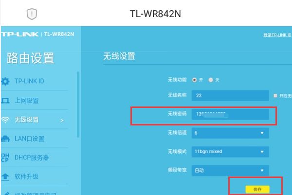 进入管理界面后,在界面的右侧修改无线密码,点击 保存,新的无线密码立即生效。