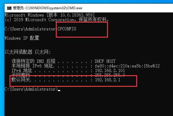 2、在出现的命令界面中输入IPCONFIG,可以看到当前路由器的网关登录IP地址。