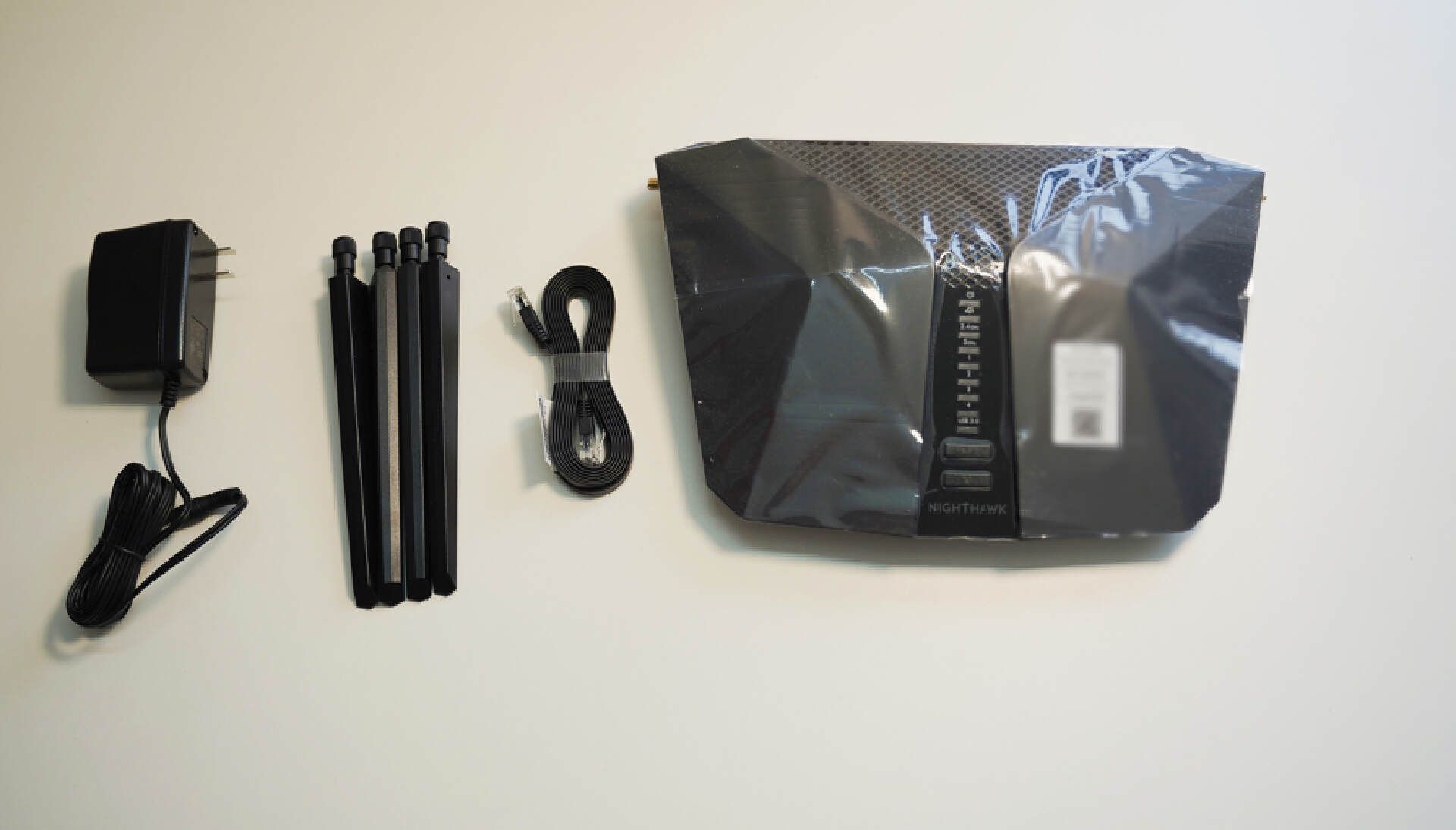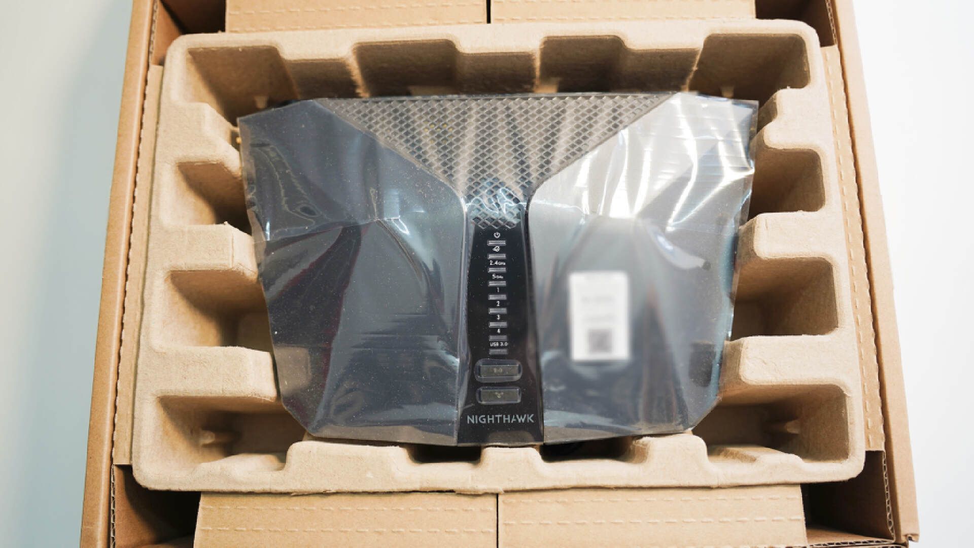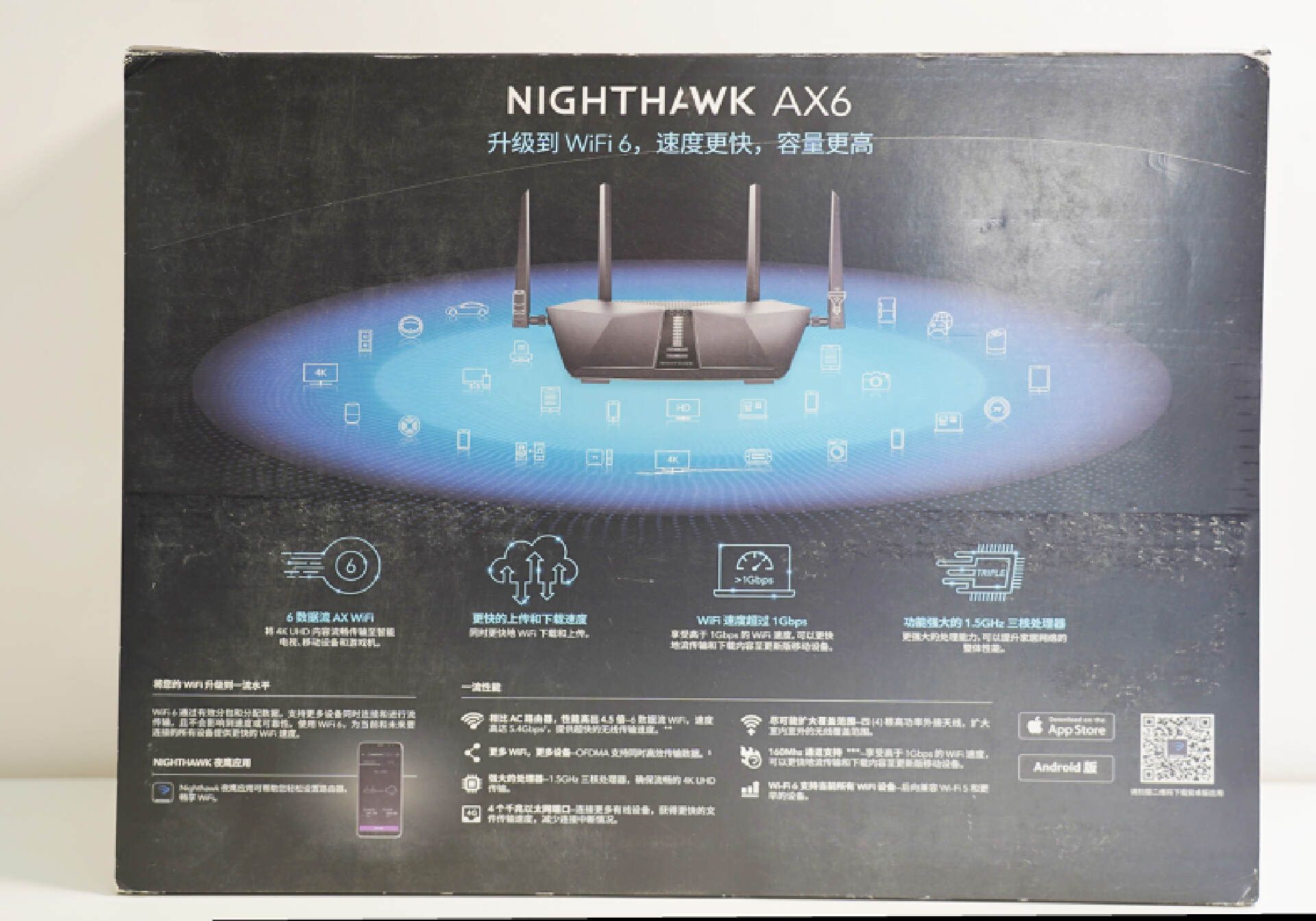 快递送到之后打开最外层快递包装,夜鹰RAX70以黑蓝搭配为主色调,透露着满满的理工男气息,包装盒左上角鲜明标注了产品的硬件配置,看来对自身的性能很有信心,打开外包装盒,里面的路由器本尊,原始造型令人眼睛一亮。