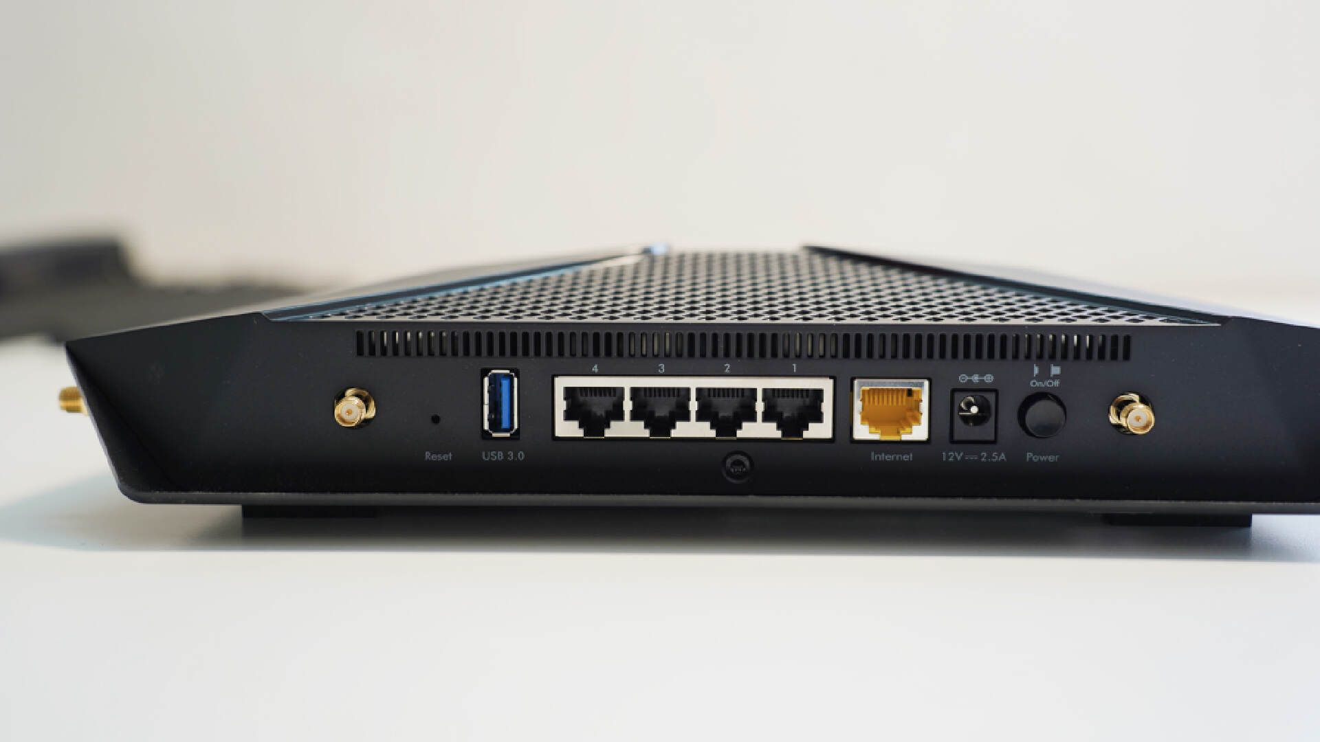 在路由器的背面,涵盖了所有插口,包括1个WAN线口,外加四个LAN插口,这些都是常规配置,在此不予过多赘诉,在LAN插口右边,有一个USB接口,它有一个非常实用的功能,插入U盘之后,可以作为家庭网盘来使用,作为小型办公场所,这个功能将更加实用,因此从夜鹰RAX70面世开始,它不仅仅是用于客户家庭网络所需,在公司区域办公也能够得到较好的施展,尤其是对于中小微企业而言,更有意义。