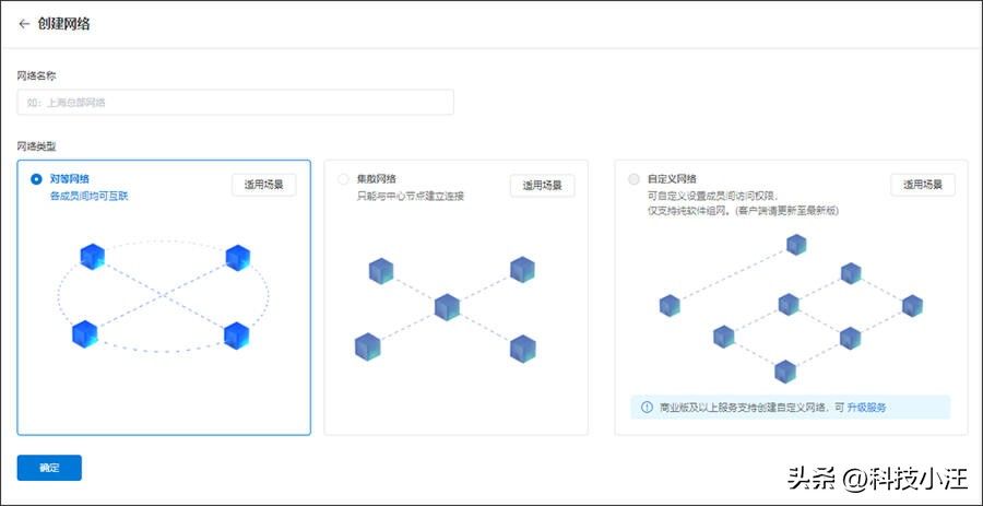 ▲智能组网其实就是构建了一个很大的虚拟局域网,组网成员通过蒲公英客户端,相同的账号就可以实现P2P点对点的共享,还能实现异地组网访问等功能。目前支持的网络类型有三种,对等网络:组网内的所有成员均可互相访问。集散网络:将组网成员区分为中心节点与普通成员,普通成员间无法互访,只能与中心节点互通。自定义网络:自定义成员之间的访问权限,目前仅支持纯软件组网。