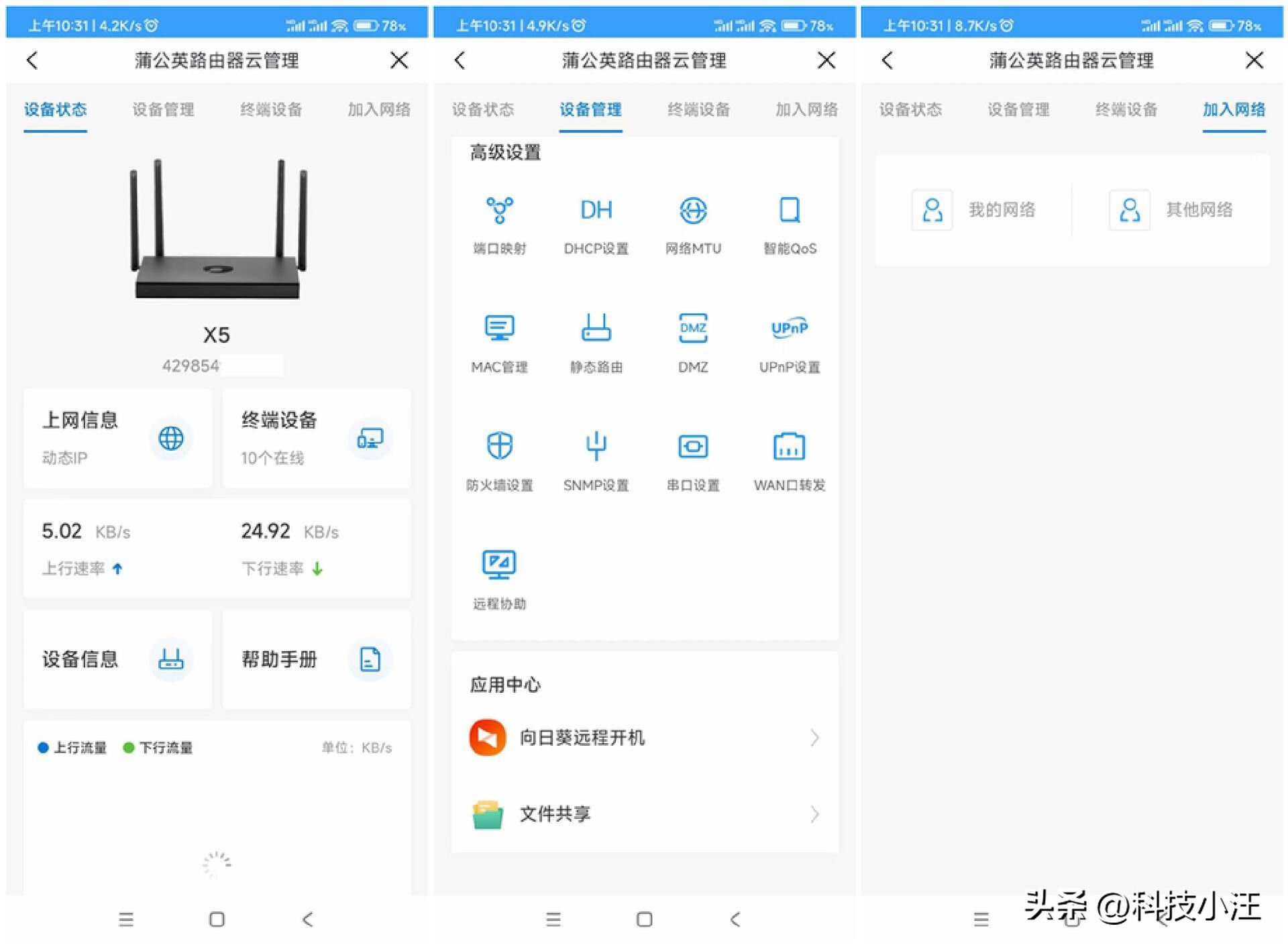 ▲作为这款蒲公英X5路由器的核心亮点功能:智能组网,在按照步骤设置好之后,就可以开始组建家庭专属网络了。智能组网以后,可以直接远程访问家中的NAS,或者家里有闲置的U盘、移动硬盘之类的存储设备,插到X5路由器上的USB接口后,也可以直接远程访问,除此之外如果家里有传统打印机,接到路由器上可以实现云打印的功能,让传统打印机变成智能云打印机。