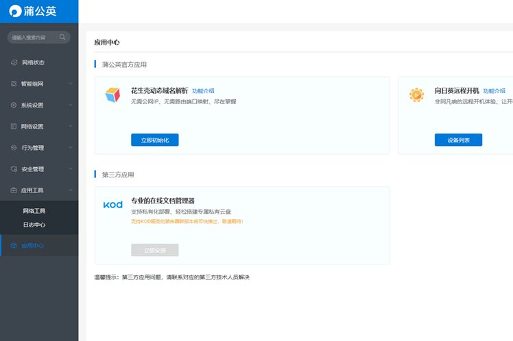 除了蒲公英管理界面之外,它还能够使用花生壳、向日葵等管理应用。花生壳可将添加的端口映射发布到花生壳云平台,无论在任何地点、时间、使用任何线路,均可利用这一服务建立拥有固定域名和最大自主权的互联网主机。