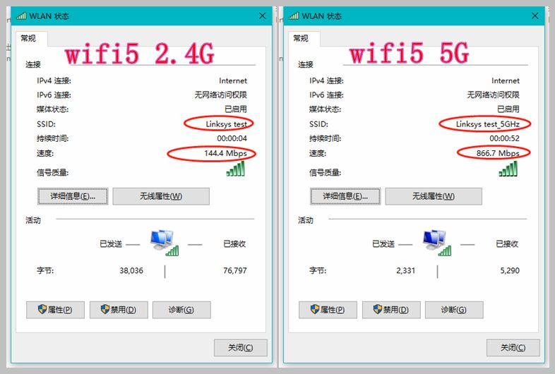 ▼我们先看一下连接后的理论速度。下图是intel Ax200连接ea8300的连接理论速度,可以看到在wifi5的标准下,2.4G频段的理论速度为144.4Mbps,5G频段的理论速度为866.7Mbps