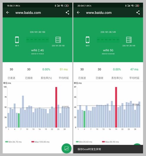 ▼延迟方面和linksys的产品差距不大。下图是半分钟的ping百度测试,可看到在2.4G和5G频段下,基本都稳定在50ms左右。这个延迟表现完全可以接受。