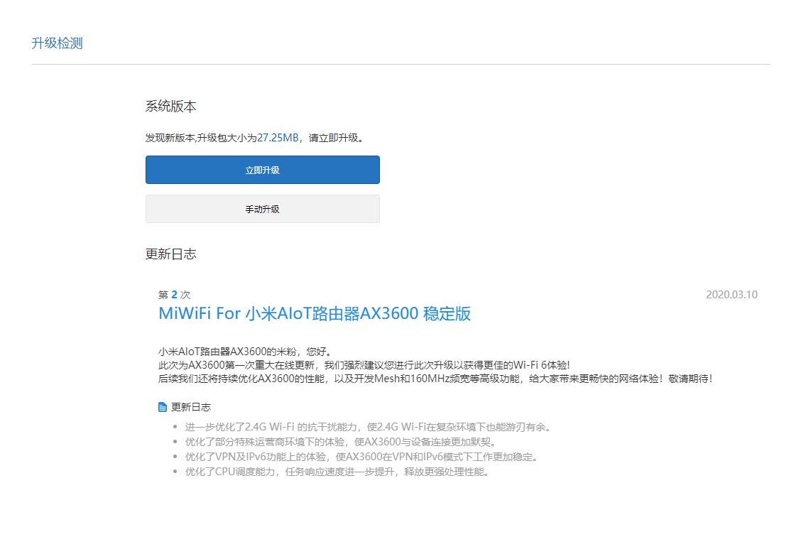 ▼系统升级界面的提示,也验证了我上文的结论。小米AX3600硬件上是支持160Mhz的5G连接的,只是固件层面还不支持。现阶段只能使用80Mhz的连接。如果后期160Mh和Mesh加入的话,这款路由器性价比就无敌了。