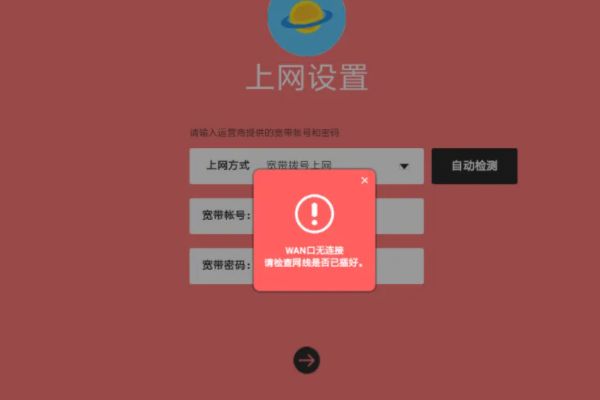 4、此界面用于设置宽带账号密码,宽带账号一般为电信手机号码,密码为手机号码后六位。如在设置中提示WAN口未连接表示路由后面的网线未插好。