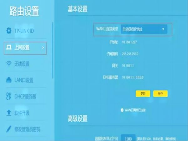 在路由器2的设置界面,点击“上网设置”——>“WAN口设置”——>“WAN口连接类型”选择:自动获取ip地址(有的路由器上叫做“动态ip”或“DHCP”)——>点击“保存”。