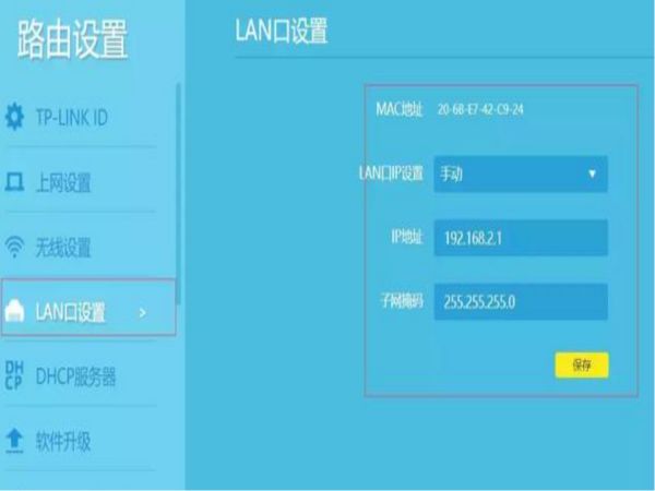 在路由器2的设置界面,点击LAN口设置,之后在右侧LAN口IP地址处选择手动,同时,IP地址修改为192.168.2.1,最后,点击保存后会提示重启路由器。