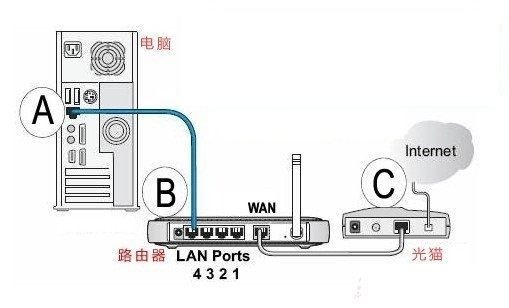 路由上一共有5个网线接口,4个是LAN接口,用来连接电脑的,4个LAN接口的任意一个都可以。还有一个WAN/Internet接口,用来连接modem或者小区宽带的接口。