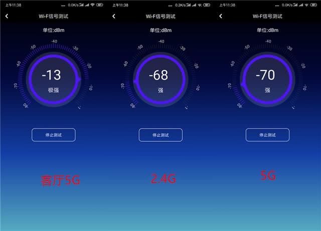 我将路由器放置在客厅,并且在客厅使用手机进行信号测试,2.4G信号和5G信号基本保持一致,大约为-13dBm。而通过穿墙测试来看,信号有一定程度的衰减,但是强度还是非常高,而且有意思的是5G信号的强度居然和2.4G相差不大,这一点令人惊讶。