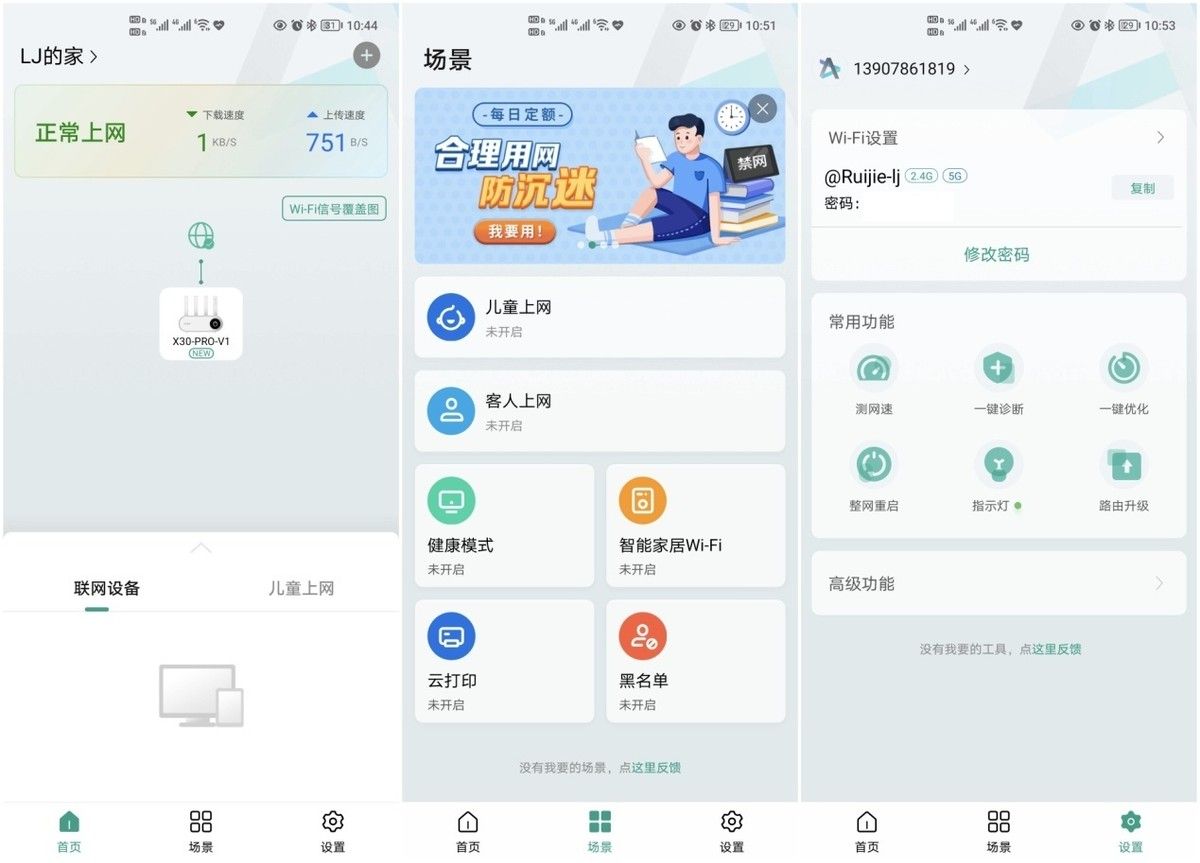 设置之后,我们来看看锐捷星耀APP里的页面,首页是联网设备的管理以及儿童上网设置,场景页面里提供了多种我们日常使用场景,这里提供了健康模式、智能家居Wi-Fi、云打印、黑名单,最后各种常用功能设置,如果大家不想显示屏一直显示,可以通过关闭指示灯让屏幕熄灭。