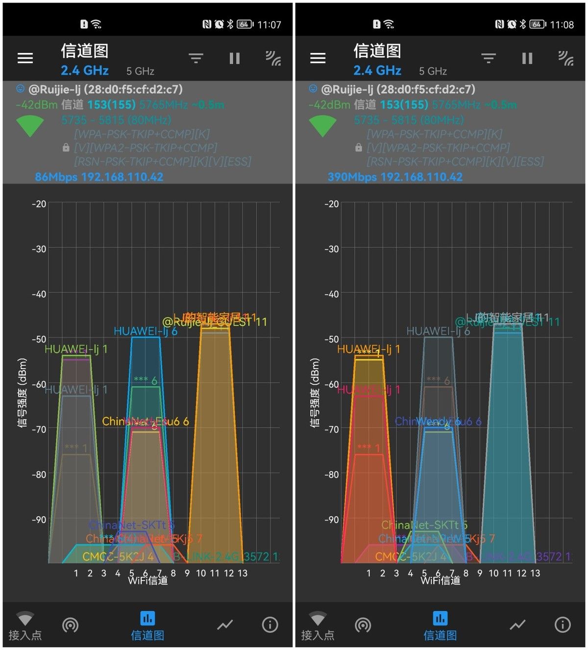 信号覆盖相信是用户最关心的问题,锐捷小白路由器外置 4 颗独立的美系高功率信号放大器(FEM),高达 1.35GHz 主频的高性能 CPU,基于 11ax 的 4*4 MU-MIMO 多通道技术,极大的增强信号覆盖性能和功率稳定性,信号测试方面,在家里多个同样的位置,其强度明显优于正在服役的华为某型号路由器,无论是看视频,还是刷抖音,都没有出现任何明显的卡顿情况,锐捷小白单台覆盖120平户型是没有压力的。