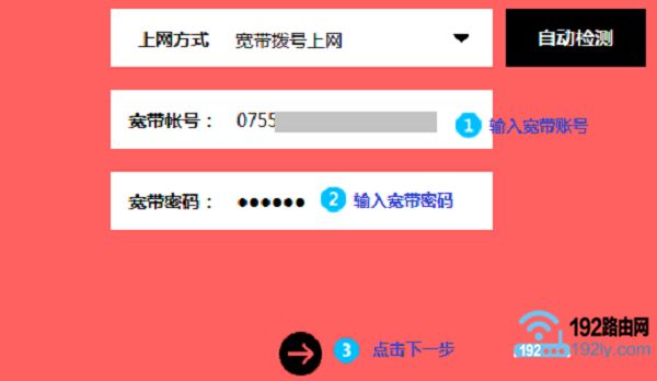 路由器会自动检测上网方式,如检测为 宽带拨号上网,在对应设置框中输入运营商提供的宽带账号和密码,并确定该账号密码输入正确,点击 下一步。如果上网方式检测为自动获得IP地址或固定IP地址上网,请根据向导提示操作,填写对应参数即可。注意:76%的用户因为输错宽带账号密码导致无法上网,请仔细检查输入的宽带账号密码是否正确,注意区分中英文输入、字母大小写、后缀是否完整等。如果不确认,请咨询宽带运营商。