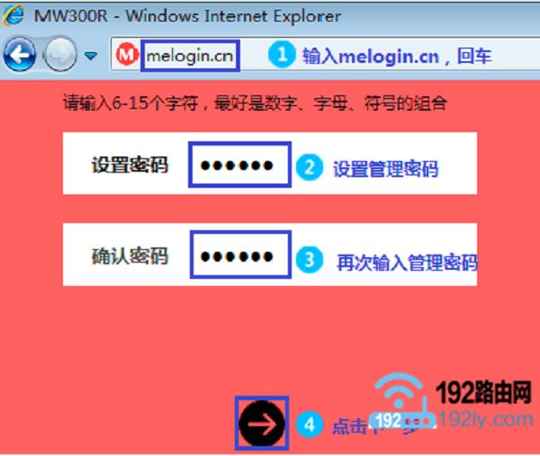 打开浏览器,清空地址栏并输入管理地址:melogin.cn(或输入IP地址192.168.1.1),回车。初次登录界面需要设置一个路由器的管理密码,后续凭该密码才能进入管理路由器。请务必牢记。