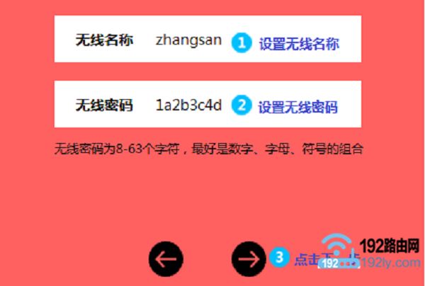 设置“无线名称”、“无线密码”——>点击“下一步”