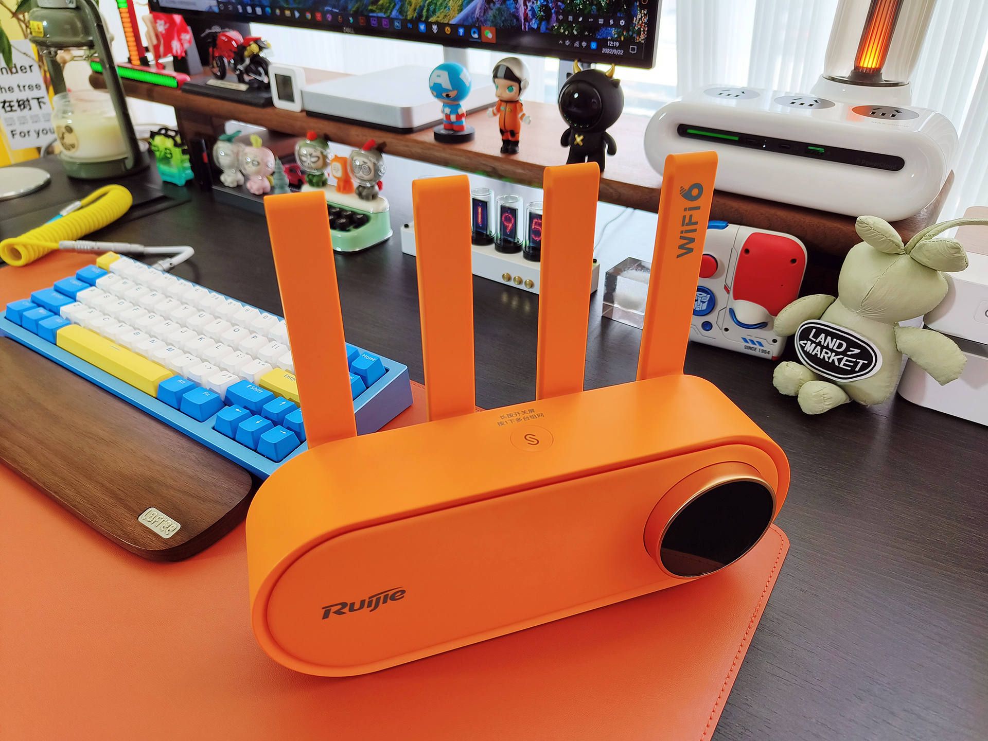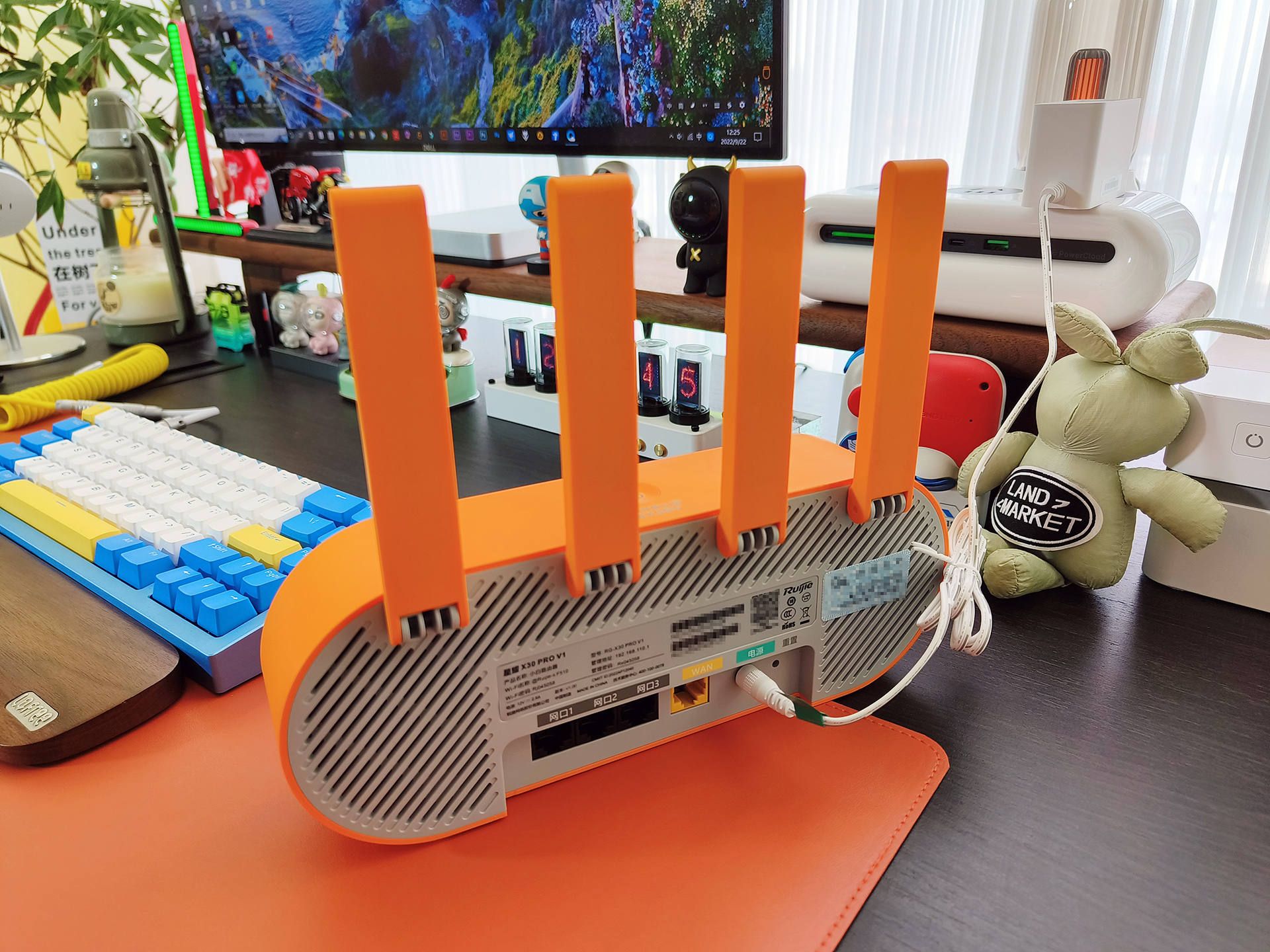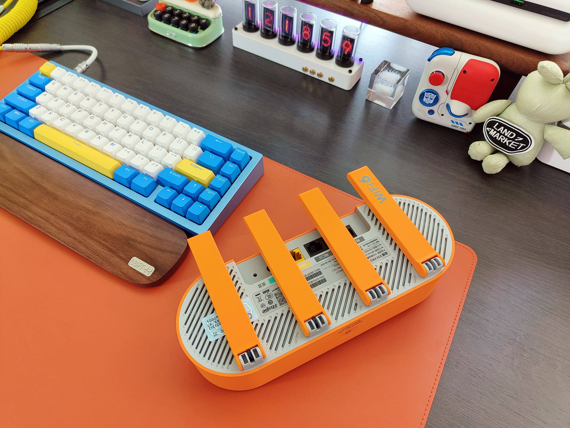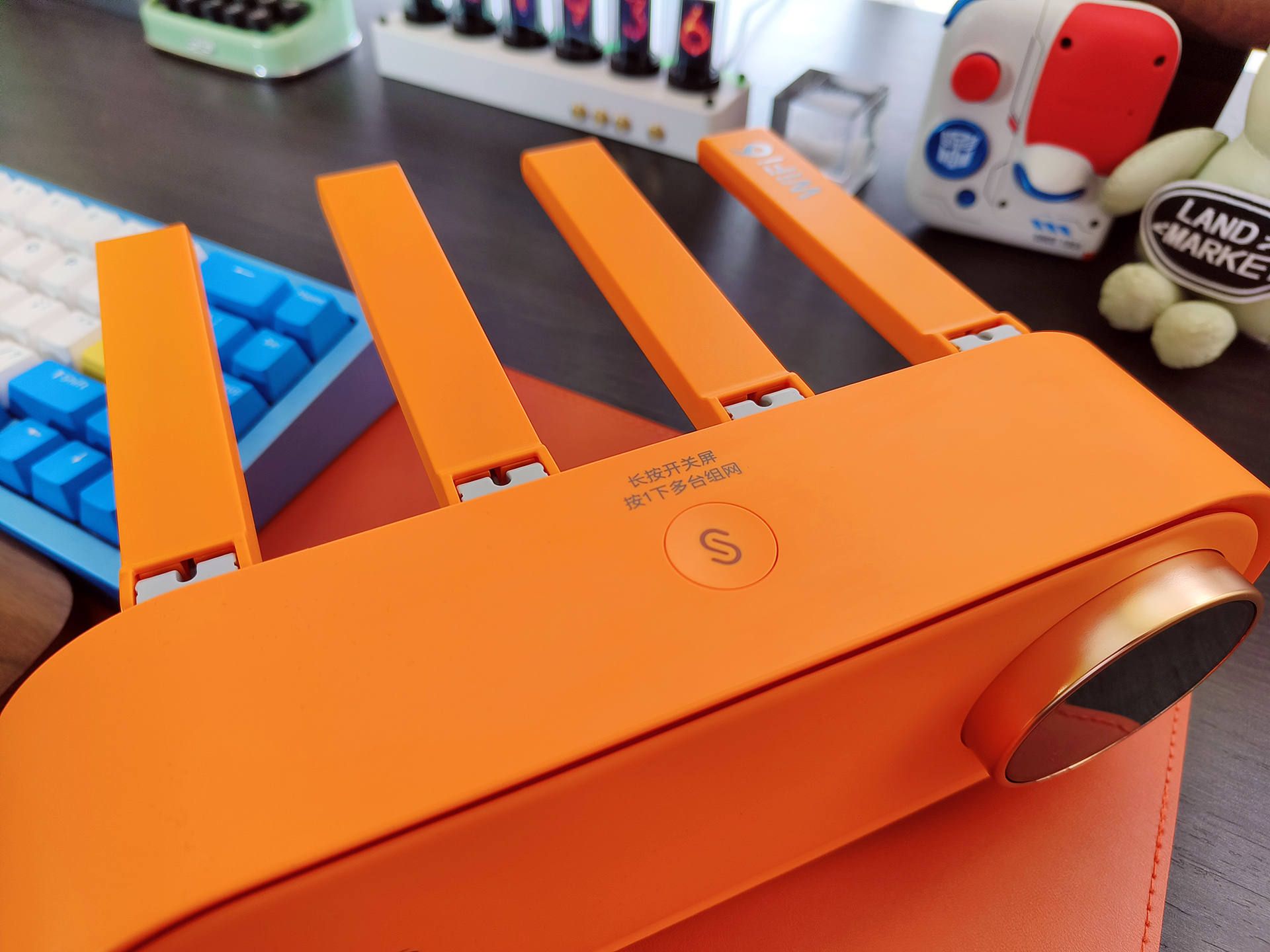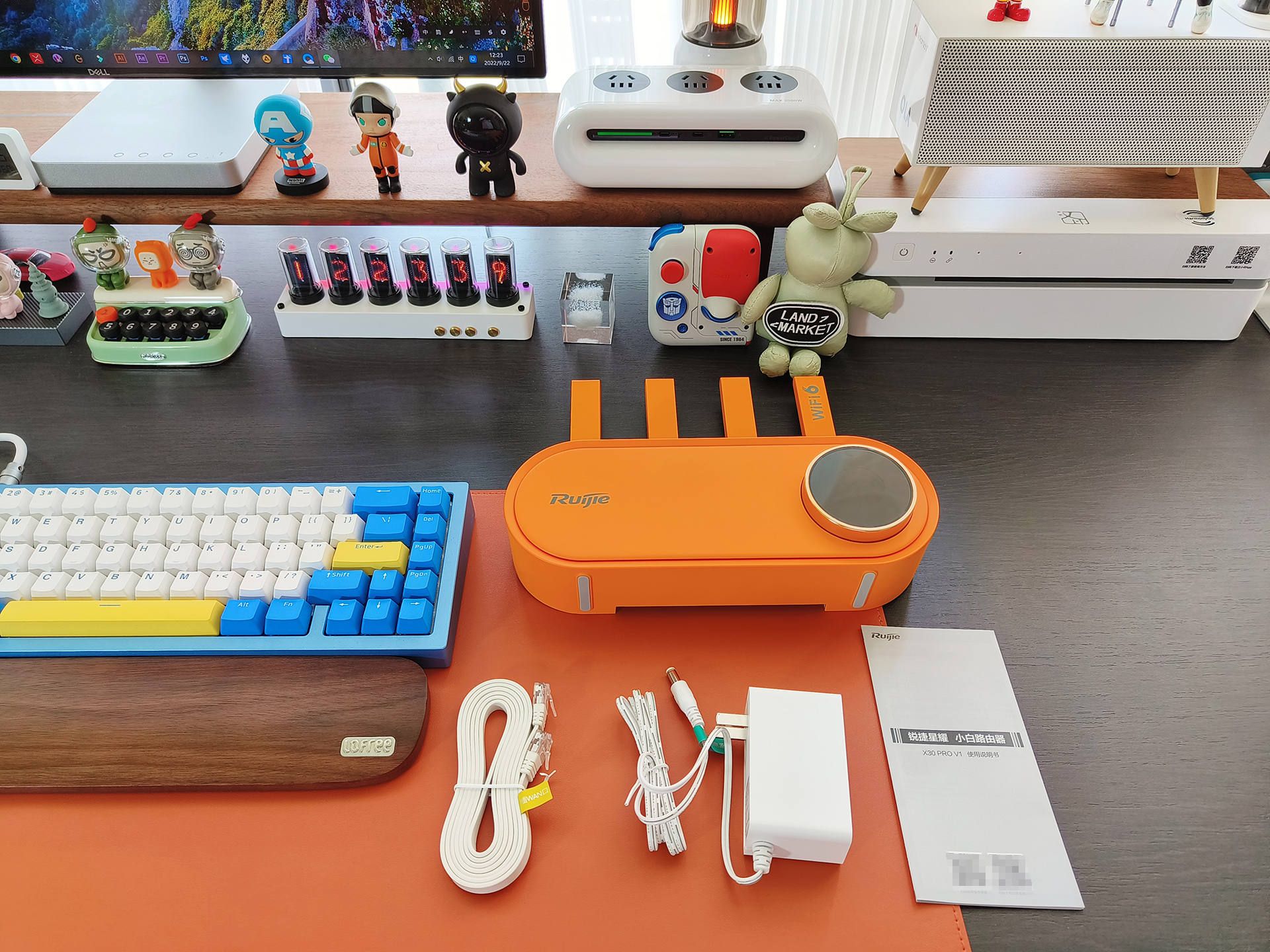 全家福方面,除了路由器主体外,还赠送一根网线、还有适配电源以及说明书,V叔选的是活力甜橙配色,说实话这个配色很耐看,作为亮色系,放在桌面也是非常好看的,和家居环境能很好的融入。