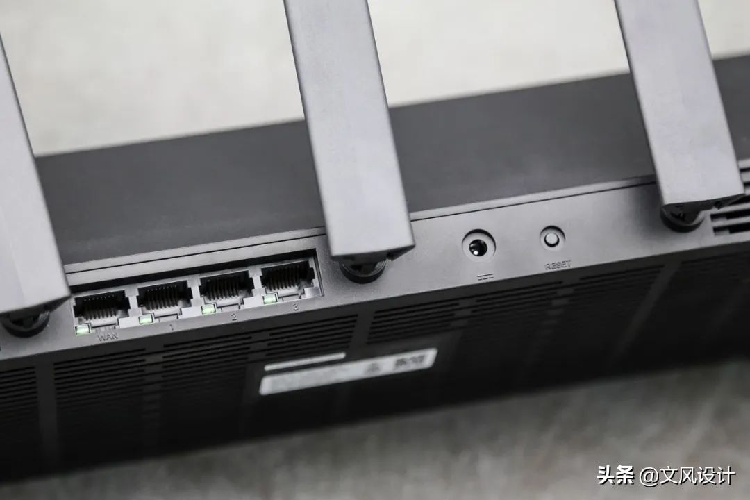 背面是电源键、手动可按的RESET键(再也不用牙签出场)和4个接口(1个WAN口和三个LAN口,自适应最高1000兆),没有USB插口。