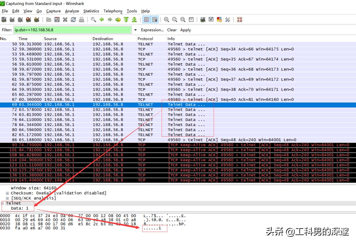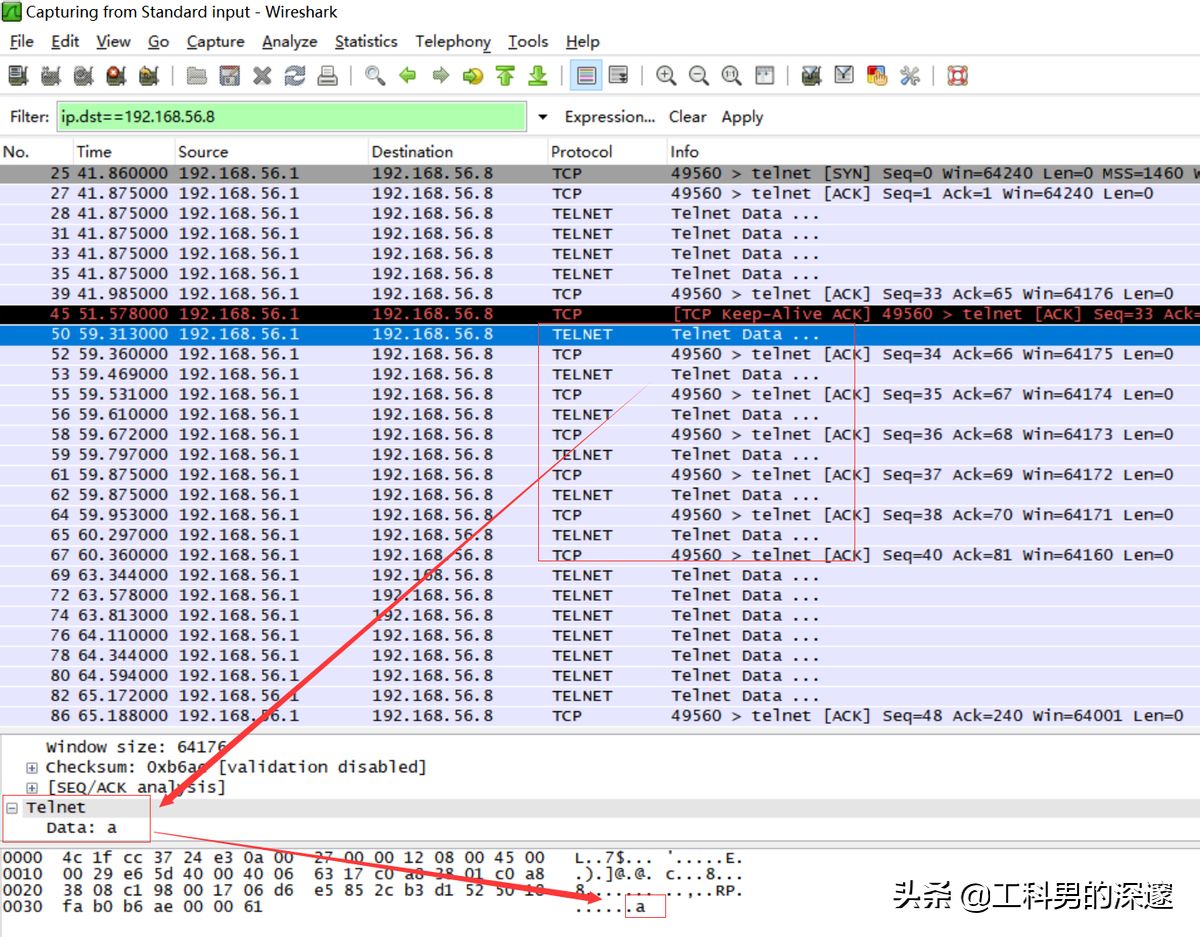 我们知道Telnet是采用明文传输用户名和密码,是不安全的协议,我们通过抓包来看一下;
