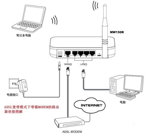 把宽带连到路由器(WAN口)上,然后把电脑也连接到路由器上(编号1/2/3/4的任意一个端口),如下图: