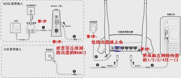 宽带是电话线接入的,按照1、2、3、4的步骤连线;宽带是网线到家的按照2、3、4的步骤连线。