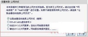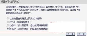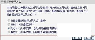 ③选择"上网方式"(常见上网方式有PPPOE、动态IP地址、静态IP地址三种,请根据下面的描述选择对应的上网方式):