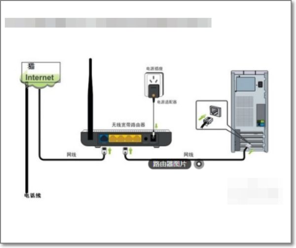 1、首先按照图示将电源线,猫都链接好,如果有台式机,用网线连接LAN口。