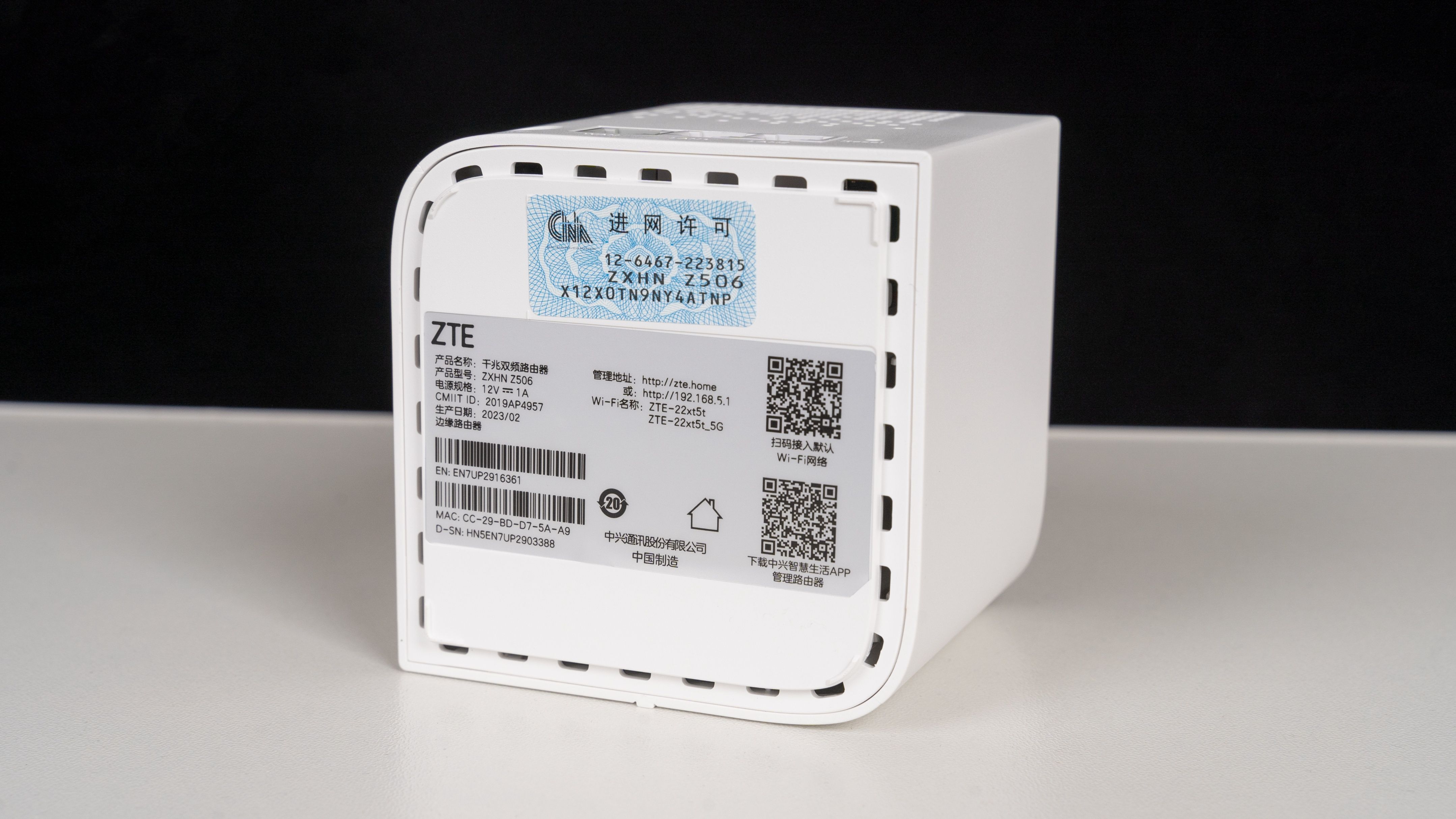 底部是拥有单独凸出来增高的区域,因为周边也有对应的散热开孔,冷空气会从这里进入。新用户上手也不需要查看说明书,底部的贴纸详细地注明了管理地址、Wi-Fi名称、中兴智慧生活APP等关键配置流程信息。