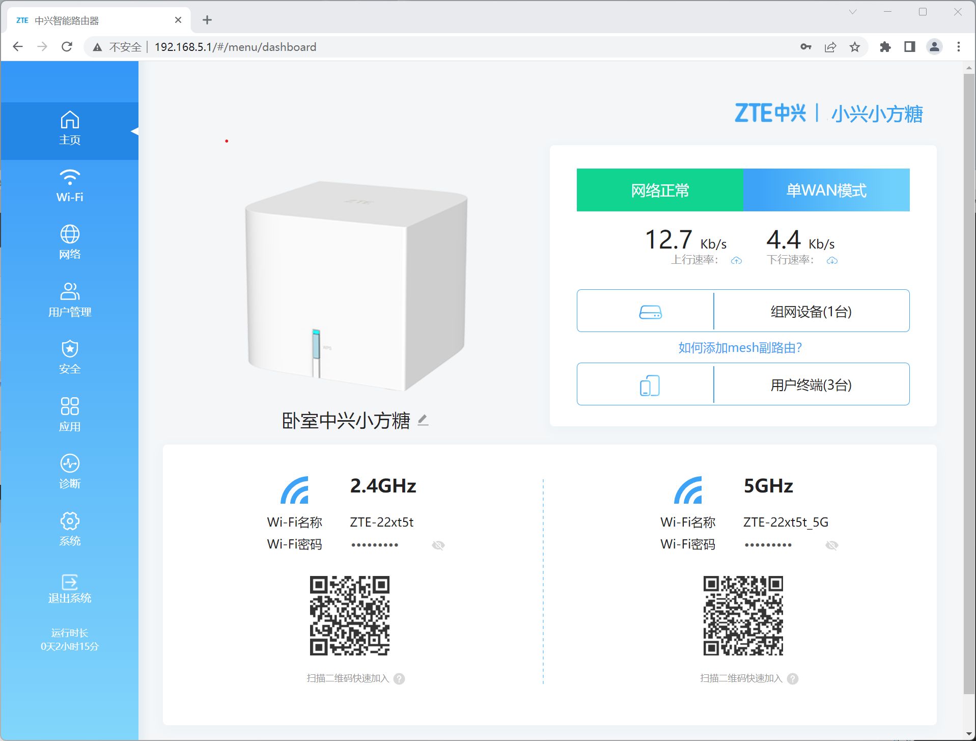 下面进行安装配置和信号测试,和主流路由器一样,小方糖也是通过传统的管理页面进行安装配置,不过它默认的IP地址是192.168.5.1,地址是特别一点的,能和其他路由器区分开来,功能非常齐全,比如涉及到IPV6/IPV4局域网、Wi-Fi射频配置等,而一般用户建议可以使用“中兴智慧生活”这款APP,没有过多的复杂参数,都是通俗易懂的功能,而且手机设置明显是比电脑方便多了。