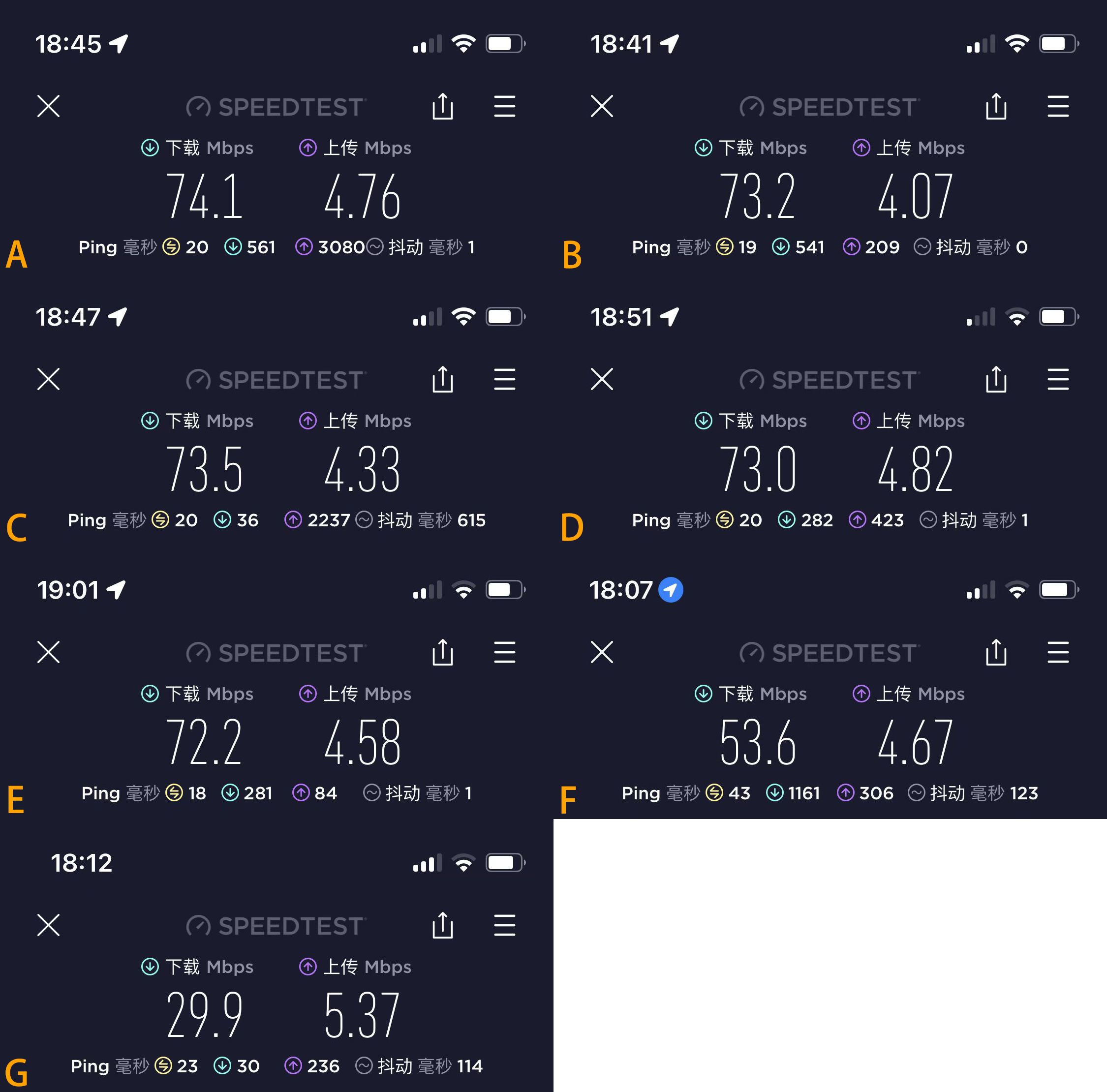 最后当然要测速验证一下,针对个人在家的使用情况,我把测试点分成A、B、C、D、E、F和G一共七个区域,测试设备是iPhone 13 mini,使用Speedtest的中国移动香港作为固定测试节点,每个区域均在相近的时间段测试,结果还是相当令人满意的,隔了一道墙的区域基本上网络环境是畅通无阻的,隔了两道墙的E区域,虽然信号强度有所减弱,但是实际体验依然是良好的,看4K视频也不会卡顿,最极限的位置是阳台G区域,家中的旧路由器,在以往想打个简单的语音通话都是无法进行的,现在至少能保证一定速率条件。