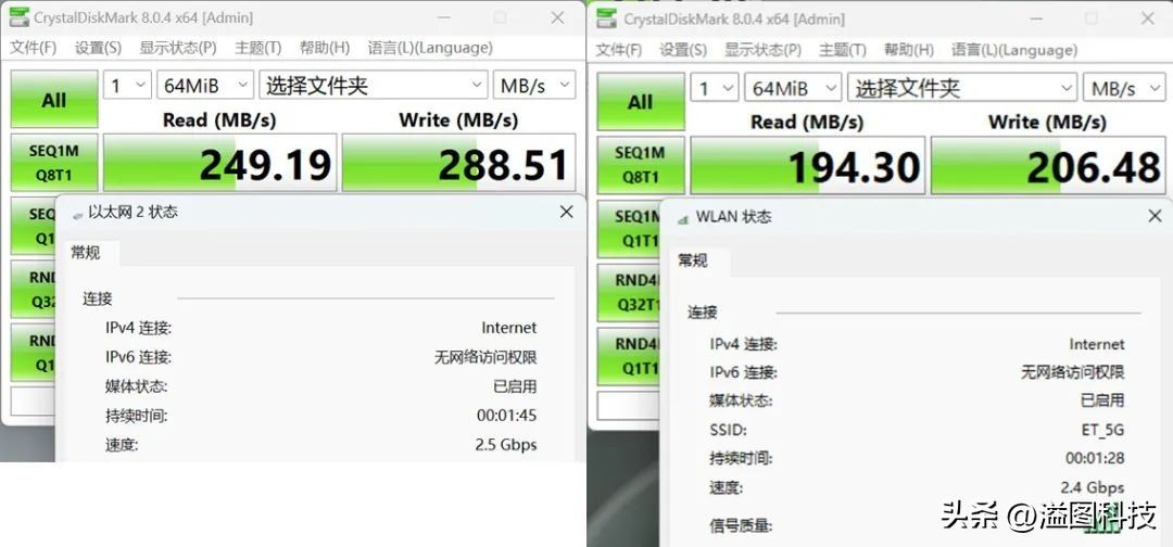 我们可以选择使用千兆网口作为WAN口,这样就能把2个2.5GbE网口都留给电脑、NAS等高速设备。实测有线连下能跑到约288MB/s,Wi-Fi 6无线连接下也有200+MB/s(近距离、无隔档)。2.5GbE网速对于存储、网卡、网线方面的要求都不高,是性价比非常高的解决方案。