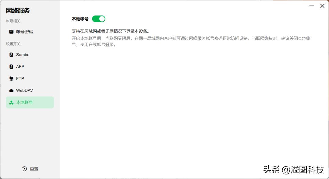 - 支持Samba、AFP、FTP、WebDAV,不过Samba里只能看到“私人空间”而不能看到“公共空间”(已向厂商反馈,但要解决可能得等大版本升级)。