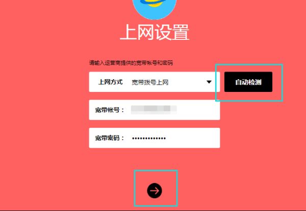 六、首先点击“自动检测”,路由器会自动检测并使用最优连接方式,接着输入运营商分配的宽带帐号与密码,点击“下一步”。